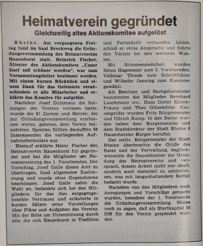 Heinrich Fischer, der Älteste des bisherigen Aktionskomitees, erklärte das Komitee für aufgelöst und den neuen Heimatverein für gegründet. Zum ersten Vorsitzenden wurde Josef Galle gewählt, sein Stellvertreter wurde Heinz Hagemeier. Das Amt des Kassierers übernahm Wilhelm Janning und Volkmar Thiede wurde Schriftführer. Ein charmantes Detail am Rande: Als Startkapital wurden dem jungen Verein damals 50 DM gespendet.