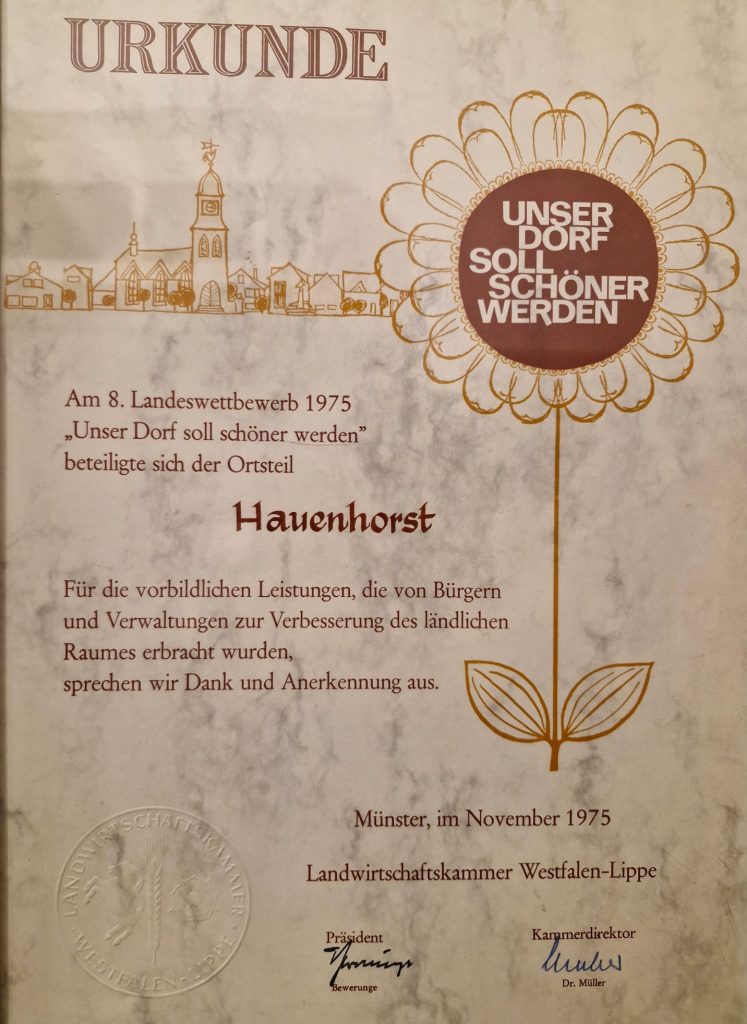 Ein Zeugnis dieser frühen Erfolge ist die hier abgebildete Urkunde der Landwirtschaftskammer Westfalen-Lippe, die dem Ortsteil Hauenhorst noch im November 1975 – also kurz vor der Vereinsgründung – für „vorbildliche Leistungen“ verliehen wurde. Sie markiert den erfolgreichen Abschluss der Zeit des losen Komitees und den Übergang in eine feste Vereinsstruktur.